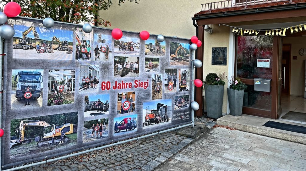 Eine kleine Überraschung in Form eines bedruckten Bauzaunbanners mit Fotos aller Mitarbeiterinnen und Mitarbeiter der Firma empfing unseren Firmenchef Siegfried Wagner anlässlich seines 60. Geburtstages heute früh vor dem Bürogebäude.