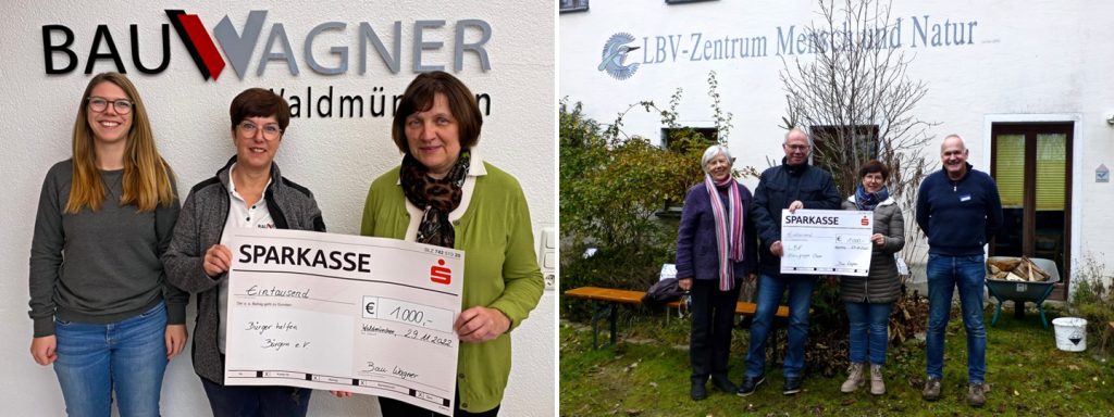 Mit dem zweiten Teil der Spenden in Höhe von erneut jeweils 1.000 Euro unterstützen wir die gemeinnützige Hilfsorganisation „Bürger helfen Bürgern“ sowie das LBV-Zentrum Mensch und Natur in Arnschwang.